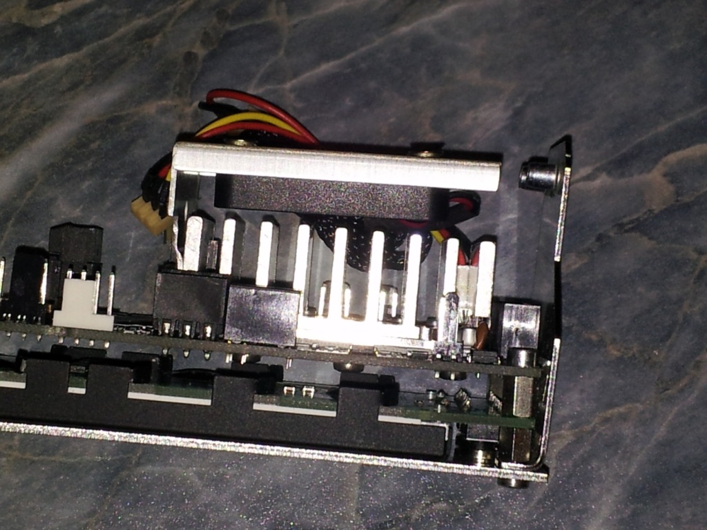bereits vor einigen Wochen habe ich mir noch Gedanken zur Kühlung gemacht. Hierzu habe ich einen kleinen Lüfter der von einem alten RAM Kühler übrig war angepasst und direkt mit einer 4 poligen Molex-Stecker-Buchsen Verlängerung eines alten Lüfters verbunden. Ich habe den Lüfter mit Heisskleber direkt an den Stecker geklebt, so dass er im eingesteckten Zustand direkt über dem Kühlkörper der Spannungswandler sitzt und diese aktiv kühlt.