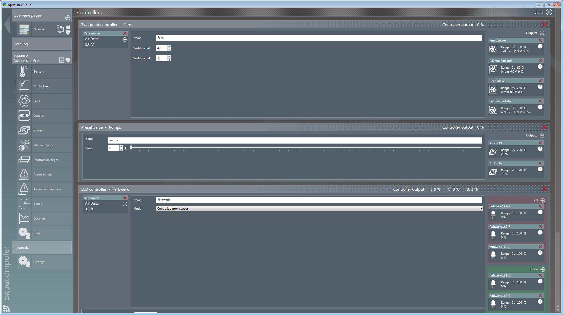 Bzgl. zwei D5: Ich hab bei mir zwei Aquacomputer D5 über Aquabus mit Aquaero 6. Du kannst beide individuell steuern (z.b. eine auf 20%, die andere auf 70%), oder alternativ auch einen Controller anlegen, dem beide D5 zugeordnet sind und dann beide Pumpe zentral steuern. Im Anhang mal ein Beispiel von mir (die Pumpe läuft auf 20% weil sie...wieso auch immer...deutlich lauter als die andere ist).