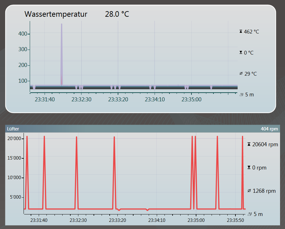 Ich habe mein altehrwürdiges Aquaduct 360 XT durch eine 360 eco+ ersetzt. Grundsätzlich funktioniert die auch, wobei es ein kleines Problem gibt. Die Aquasuite zeigt bei allen Sensordaten immer wieder extreme Ausreisser an. Siehe Anhang. Mein Kühlwasser war definitiv nie 462 °C warm :D