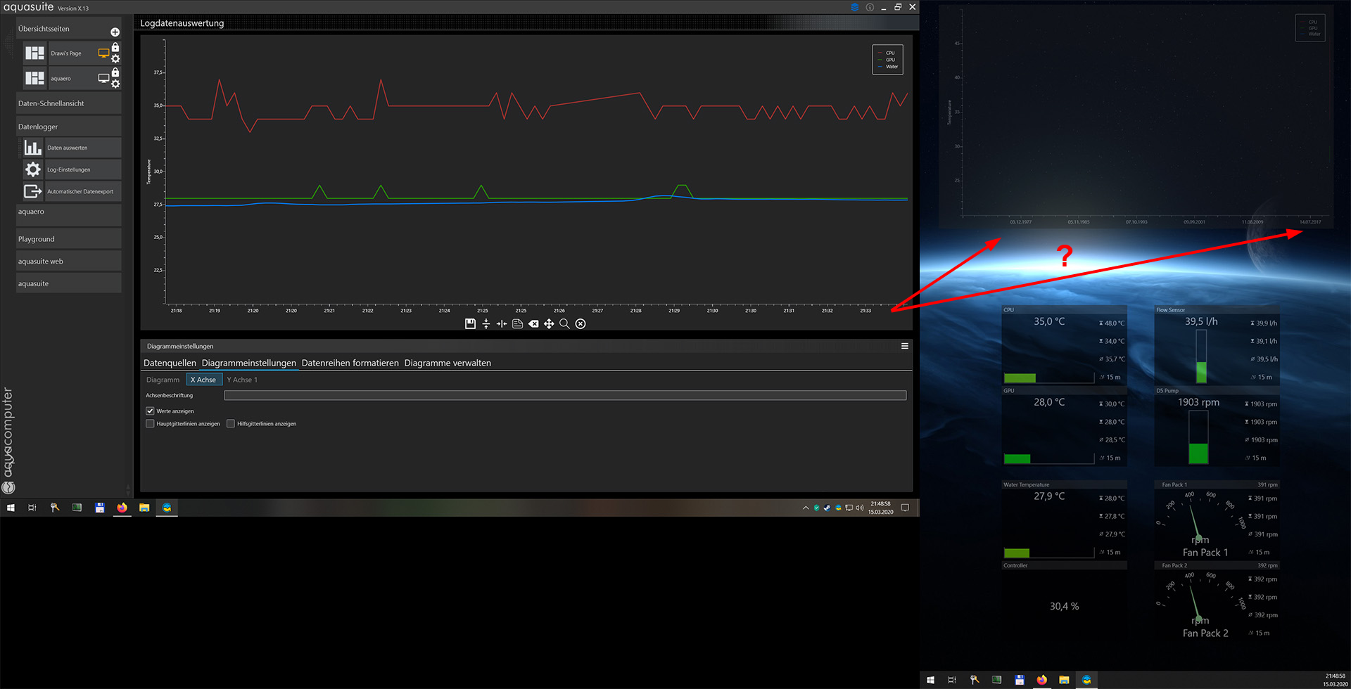 Mein Overlay zeigte anschließend jedoch keine CPU (rot) und GPU (grün) Kurve mehr im Diagramm an. [Originalzustand: BILD1, rechter Monitor ] Die Wassertemperatur (blau) wurde allerdings noch gelogt. Unter Datenlogger -> Daten auswerten, konnten CPU und GPU nicht ins Diagramm eingefügt werden, weder per Doppelklick noch per drag&drop. Also habe ich diese beiden in den Log-Einstellungen neu angelegt, Datenquelle gewählt und so ließen sich CPU und GPU Temperaturen wieder anzeigen.