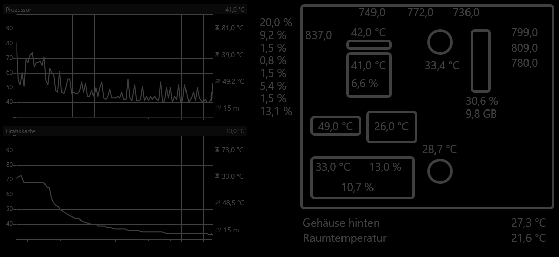 ich habe mir auf meinem zweiten Monitor mithilfe von der Aquasuite Monitor ein paar Overlays zur Überwachung von Lüftern und Temperaturen eingerichtet: