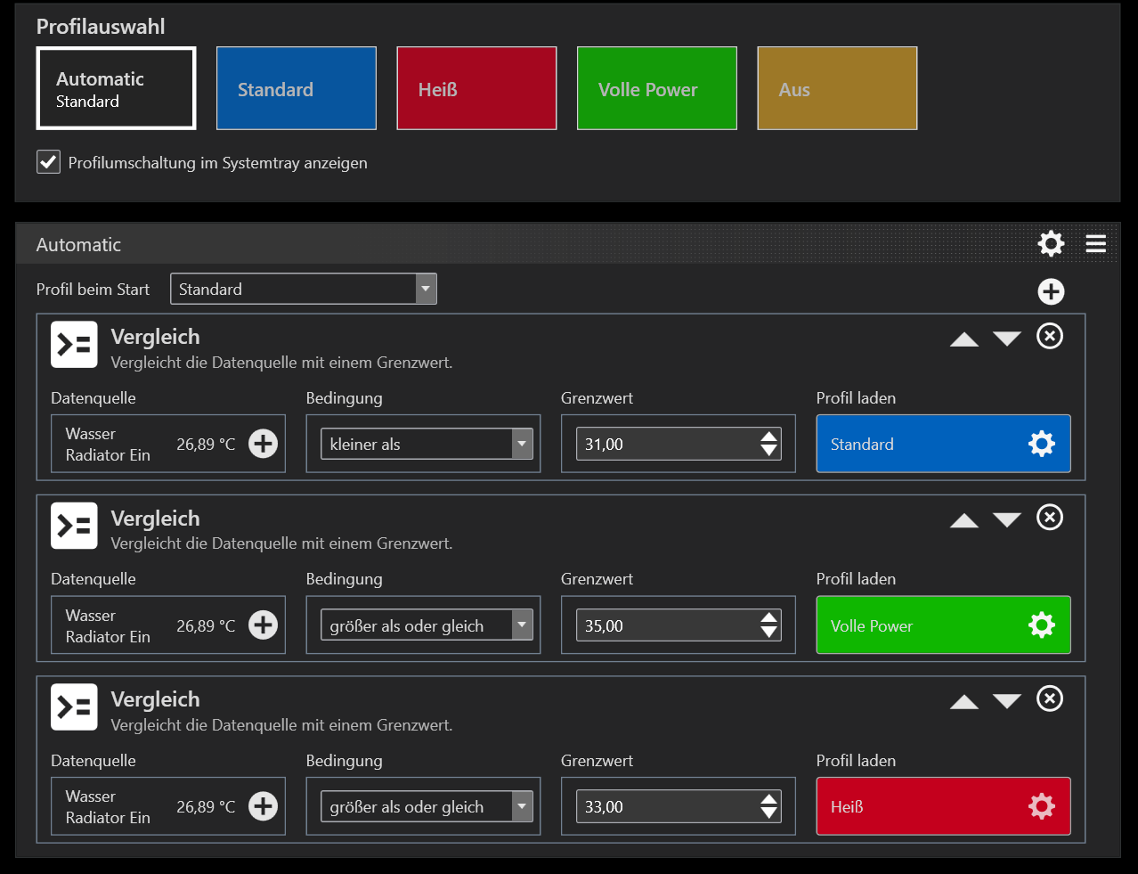 Für zwei Profile kann man eine Hysterese realisieren, also dass z.B. bei über 35° Profil 2 aktiviert wird, aber erst wenn die Temperatur unter 33° sinkt wieder Profil 1 aktiviert wird.