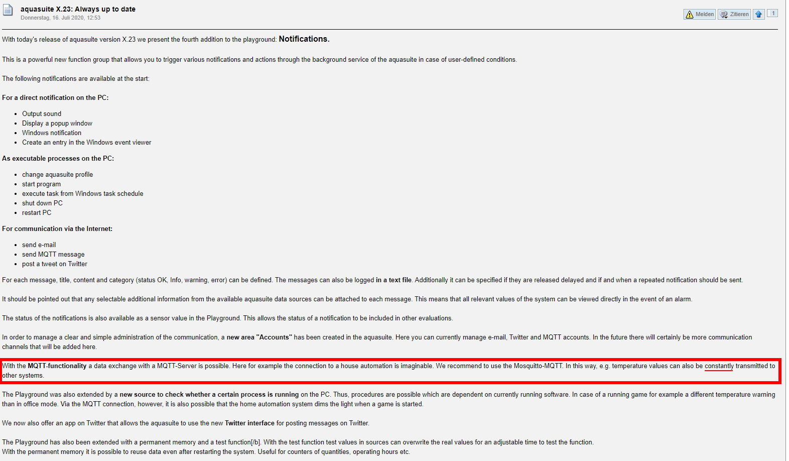 ich finde die Einführung von MQTT in Aquasuite super, da ich das Protokoll ja bereits länger für meine Hausautomatisierung nutze.
