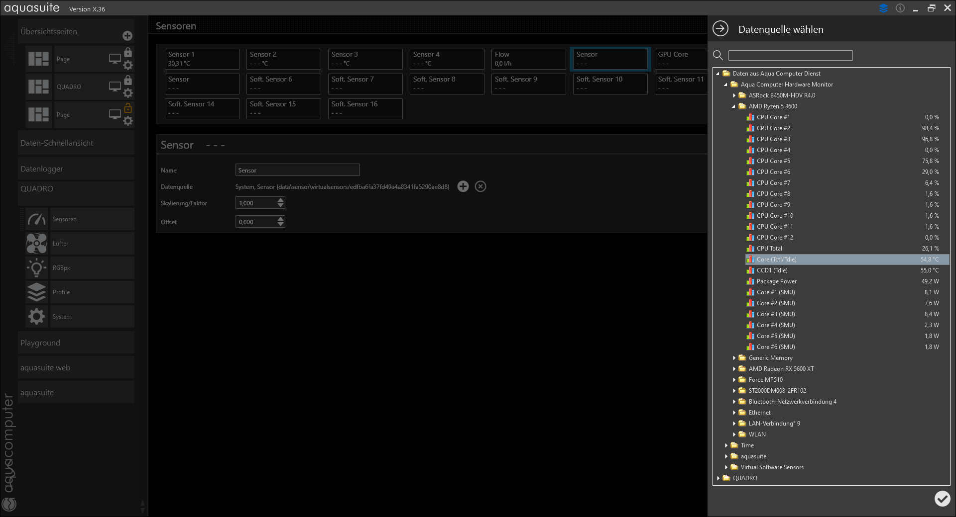 Hab mal 2 Bilder angehängt. So sieht das bei mir aus, wenn ich im Quadro den Softsensor konfigurieren, Ich empfehle dir auch satt des Aquasuite-Hardware-Monitoring auf Tools wie HWinfo zusetzen.