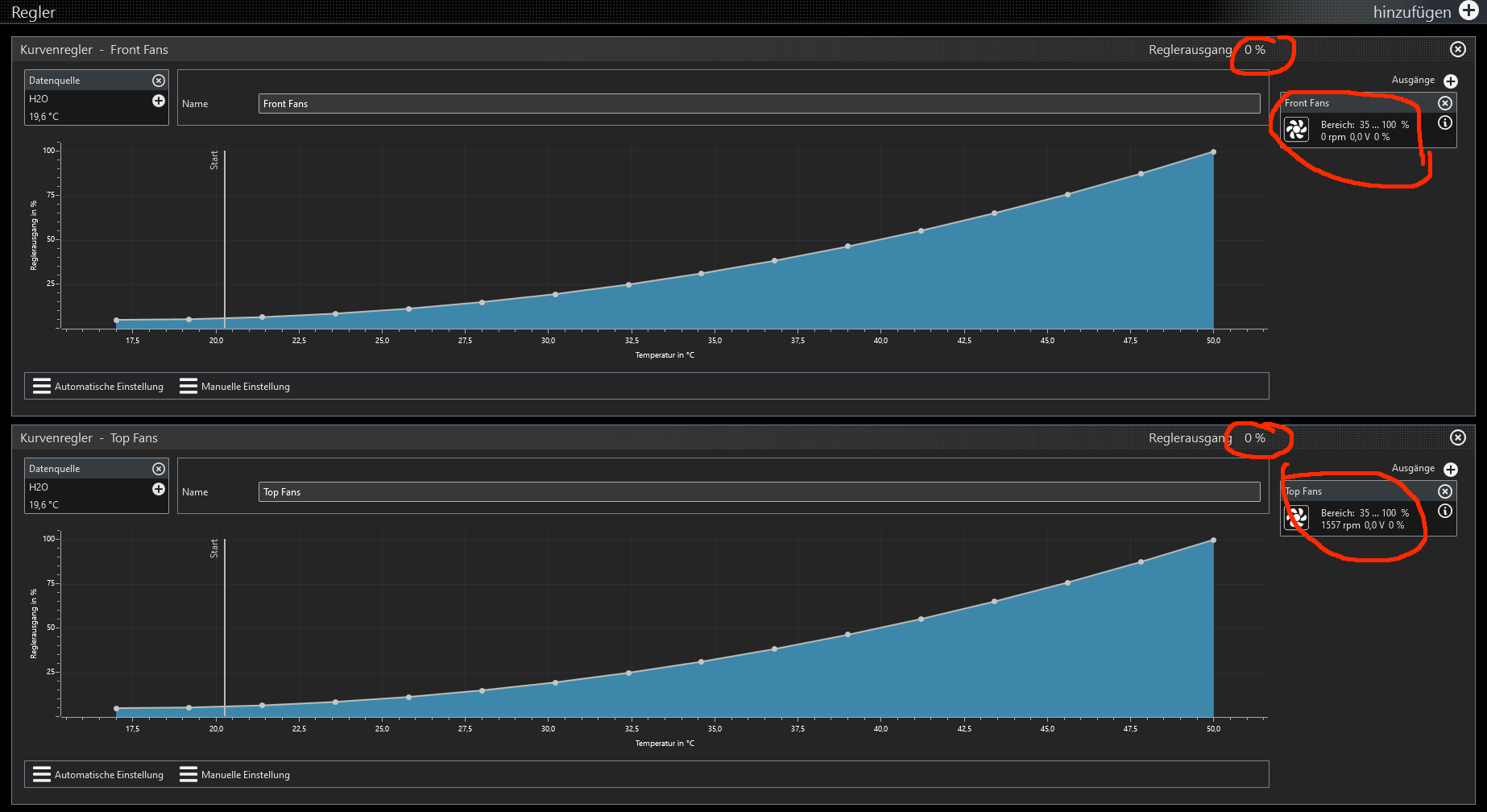 Ah okay, das war mir nicht bewusst... dachte mit "halten" war auch "halten" gemeintZum Punkt Minimalleistung halten: Das bedeutet, dass die Lüfter immer mindestens mit den 35% laufen, die Du in den Lüftereinstellungen hinterlegt hast, es bedeutet aber nicht, dass sie nicht mehr auf eine Regelung reagieren, somit wäre es nicht richtig, wenn sie nicht mehr auf die Wassertemperatur reagieren würden.
