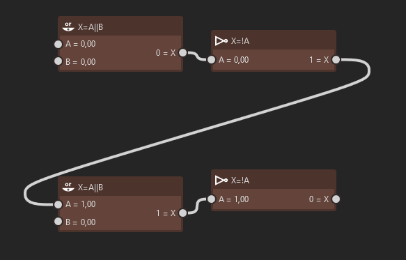 Jetzt ist es leider nicht möglich den Ausgang des unteren Inverters mit einem der Eingänge des oberen Oders zu verbinden. Sind solche Konstruktionen in der Aquasuite nicht unterstützt? Jetzt gibt es ja noch unter den Logikfunktionen den Schalter, Speicher und Trigger. Allerdings fällt mir nicht ein wie ich diese so verschalten kann, um meine gewünschte Funktionalität zu realisieren.
