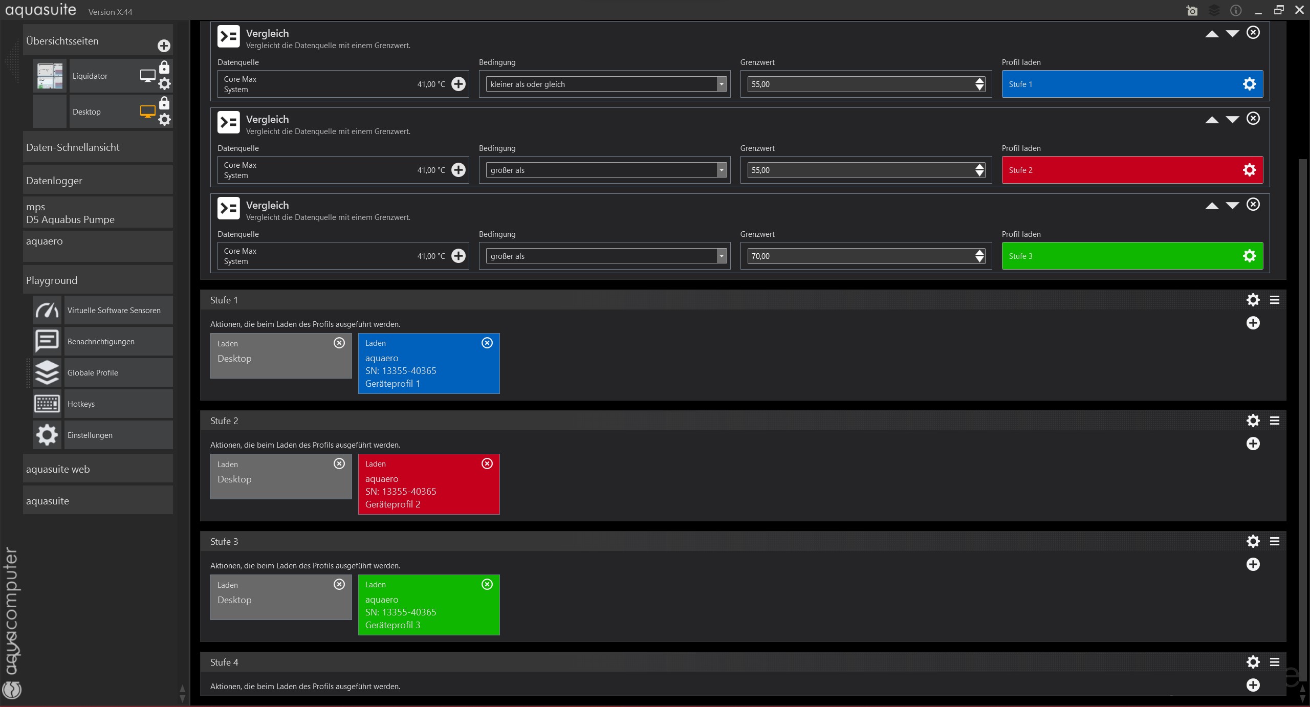 Aber leider schaltet es nie auf "Stufe 3".Ich nehme mal an, daß die Bedingungen von Stufe 2 und Stufe 3 sich gegenseitig ausschließen (beide auf "größer als"), stelle mich aber seit Stunden zu blöd an, das korrekt zu konfigurieren.