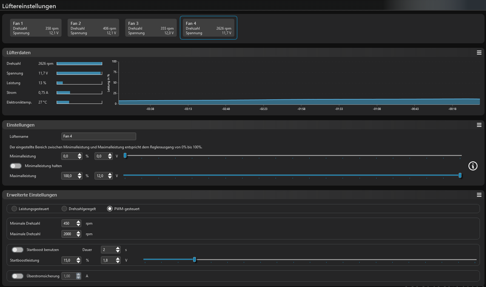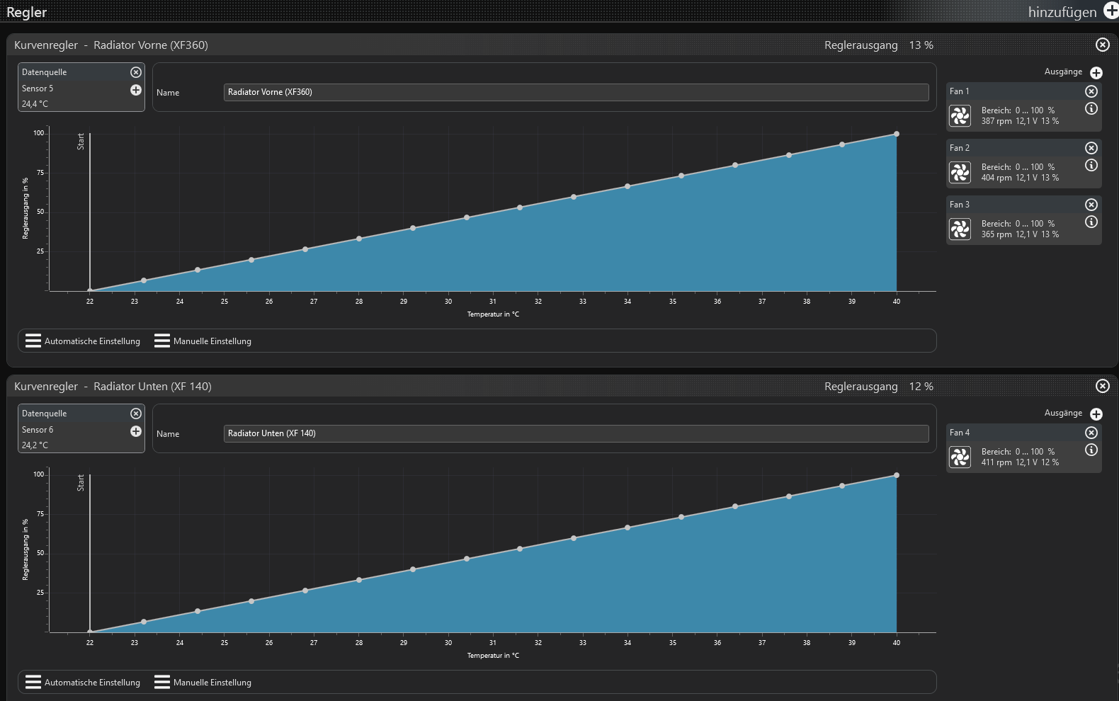 Der zweite Lüfter lässt sich nicht wirklich regeln. Erst Mal passiert gar nichts, ab einem gewissen Reglerausgang fährt er dann dierkt auf ca. 2600 Umdrehungen hoch.