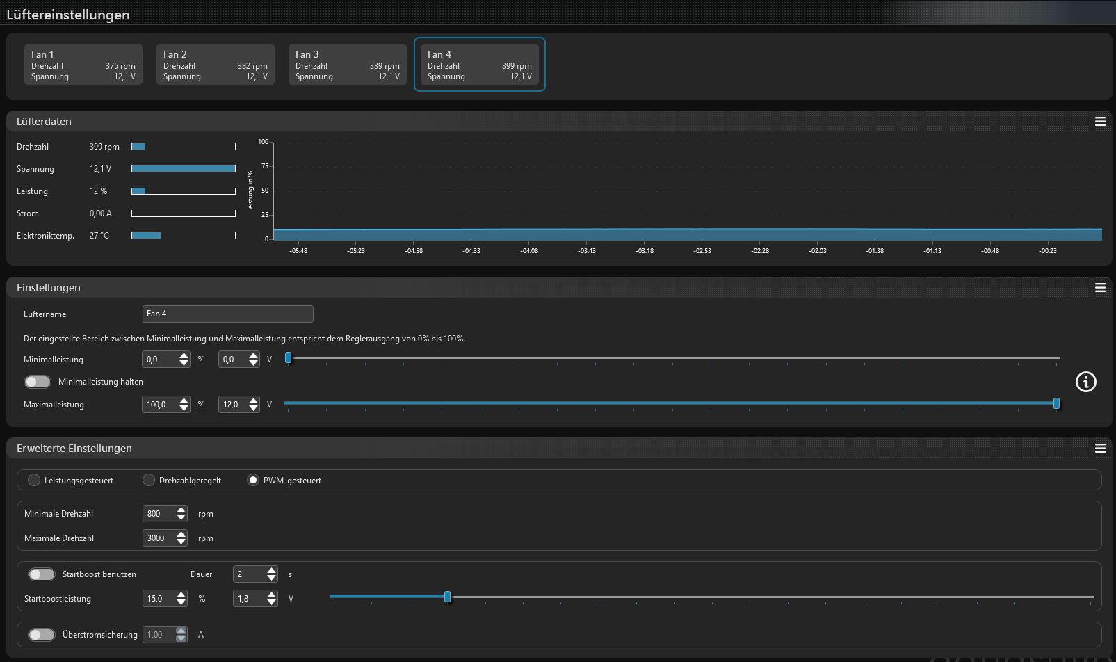 Ich habe alle meine Lüfter per PWM-Signal angesteuert (jeder Lüfter hat einen eigenen Ausgang mit PWM-Signal).