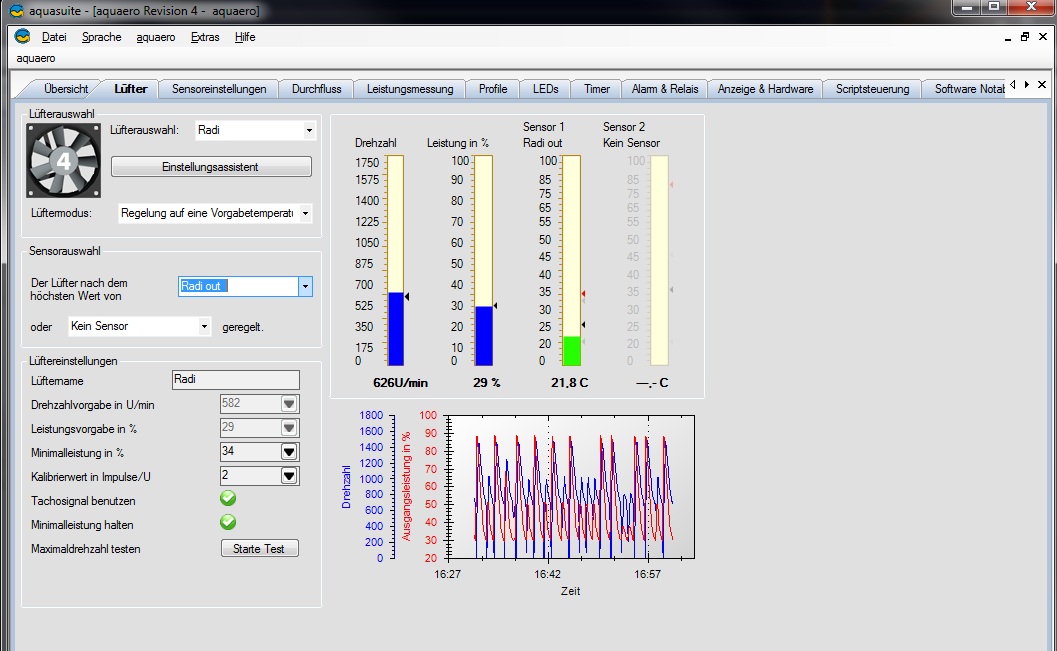 Ist recht einfach, die Maxialdrehzahl wurde falsch ermittelt, da die Lüfter eventuell unsinn ausgegeben haben. Damit stimmt die kompplette regelkette nicht mehr.Bei mir trat gestern was komisches ein, und zwar gingen plötzlich alle Lüfter (5 Stück = max. 6,25W ) vom Ausgang 1 auf 100%, ich musste dann erst nochmal die max. Drehzahl ermitteln lassen damit sie wieder vom Aquaero runter geregelt werden!?