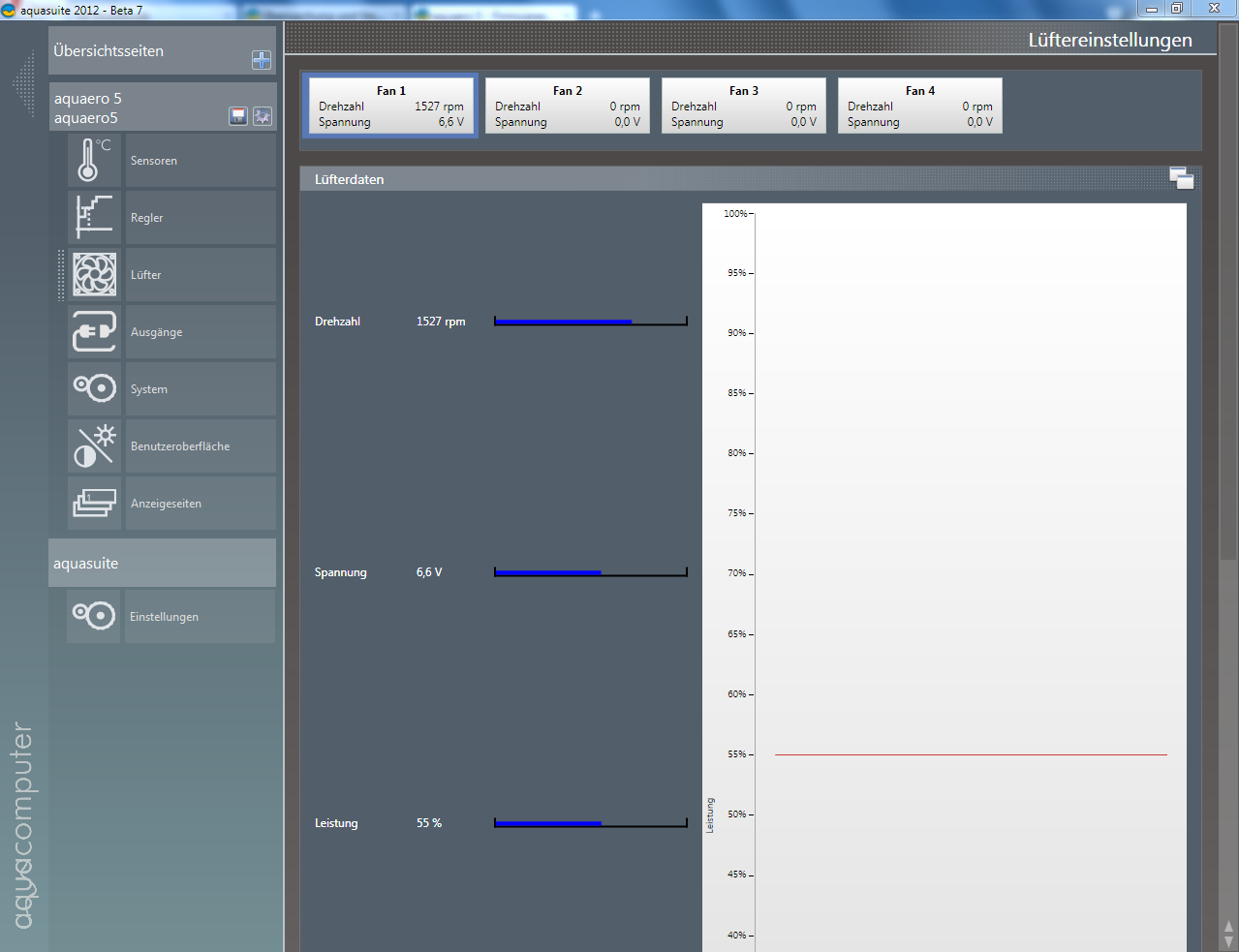 ich habe einen Kurvenregler eingestellt und unter Lüfter Minimaldrehzahl 55% + Drehzahl halten aktiviert.
