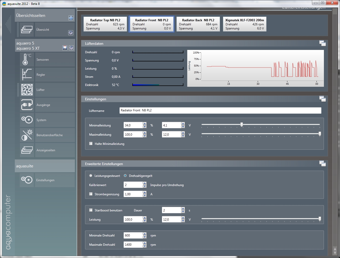 Dann ist der Kurvenregler die flasche wahl, dafür nimmt man den Sollwertregler. => Lüfter laufen nur wenn es die Temperatur erfordert und nur so schnell wie sie müssen.Ich will ja genau das erreichen, das der Front Radiator bis zu einer gewissen Temperatur passiv betrieben wird und sich erst ab Temp x die Lüfter dazuschaltet.