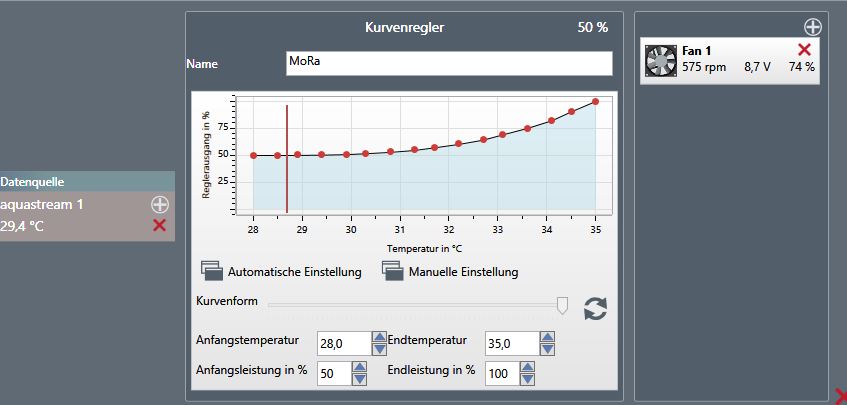 ich habe mir zwecks präziser Steuerung ein Aquaero eingebaut. Das Problem welches ich habe, sieht man im Angehängtn Screenshot. Die Lüfterkurve die ich eingestellt habe wird offenbar ignoriert und ein zu hoher Wert angenommen. Ist dieses Verhalten normal?