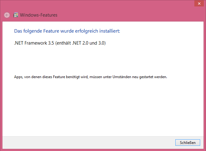 Ich habe mein System gerade neu aufsetzen müssen weil es seit der LaTex Installation immer abgeschmiert ist, keine Ahnung woran es lag. Naja jedenfalls habe ich jetzt Windows 8.1 frisch installiert, alle Updates installiert und wollte gerade die Aquasuite 4 installieren. Da kam dann wie von dir beschrieben die Fehlermeldung. Allerdings kam 1 Minute später automatisch eine Meldung von Windows 8.1 mit dem Inhalt "eine App benötigt .Net 2.0 und 3.5, möchten sie das Feature herunterladen und installieren?" Klick man auf installieren sollte es bei Erfolg so aussehen: