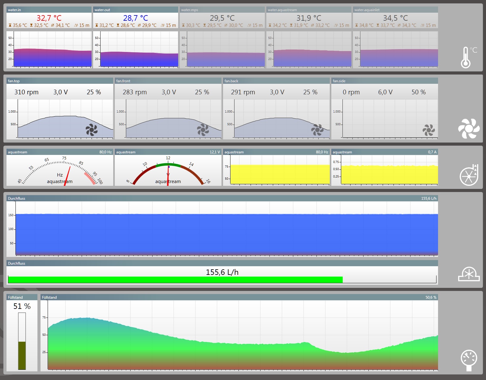 Ich habe unter dem Reiter System die in Milimeter gemessenen Werte betreffend die Größe des aquainlet und die Höhe des Wasserstandes eingegeben und "Kalibireren" geklickt. Nach dem Klick scheint auch alles zu stimmen (ca. 2/3 Füllstand).