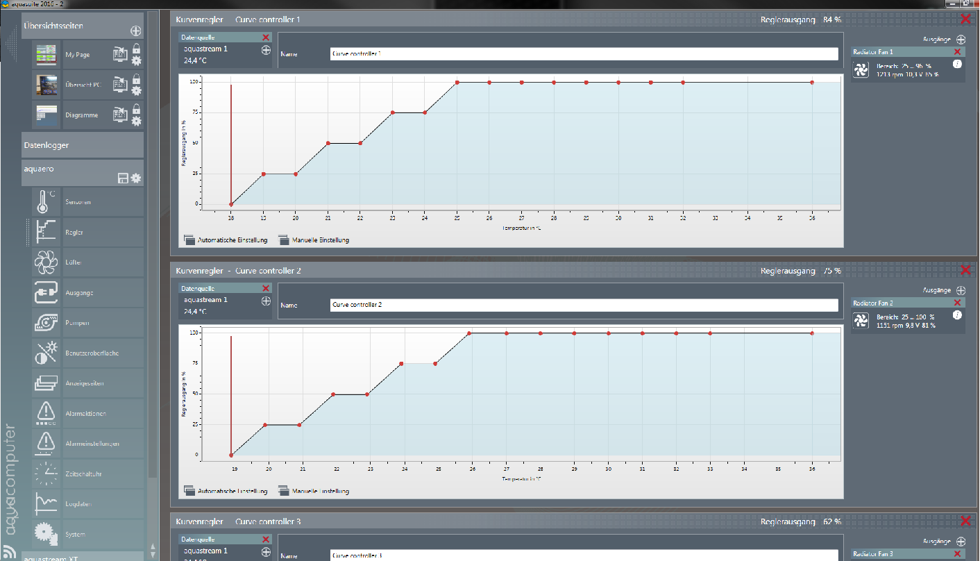 Ich arbeite mit den Kurvenreglern . Die arbeiten recht flink ! 4x120 mm Lüfter .