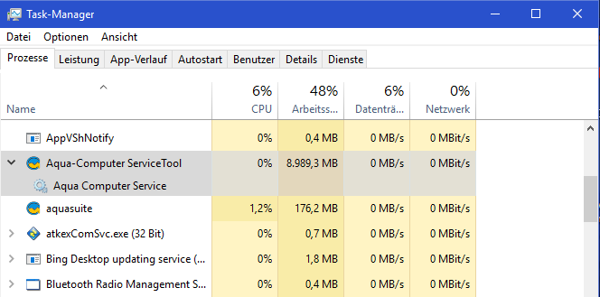 falls die aquasuite in der zeit gelaufen ist mache den test noch mal ohne aktive aquasuite. also die aquasuite beim systemstart nicht automatisch starten lassen und auch nicht manuell starten. Vor dem test den pc neu starten.Stand 8,5 Stunden später ohne Plugins: Das Aqua Computer ServiceTool belegt jetzt 373 MB.