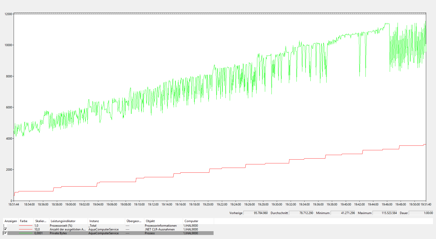 Das einzige was mir jetzt Aufgefallen ist... Die Privat Bytes liegen ca 25 MB über dem wert den der Taskmanager für das Aqua-Computer Service Tool anzeigen. Kann jetzt aber gerade nicht sagen ob das davor auch so war.
