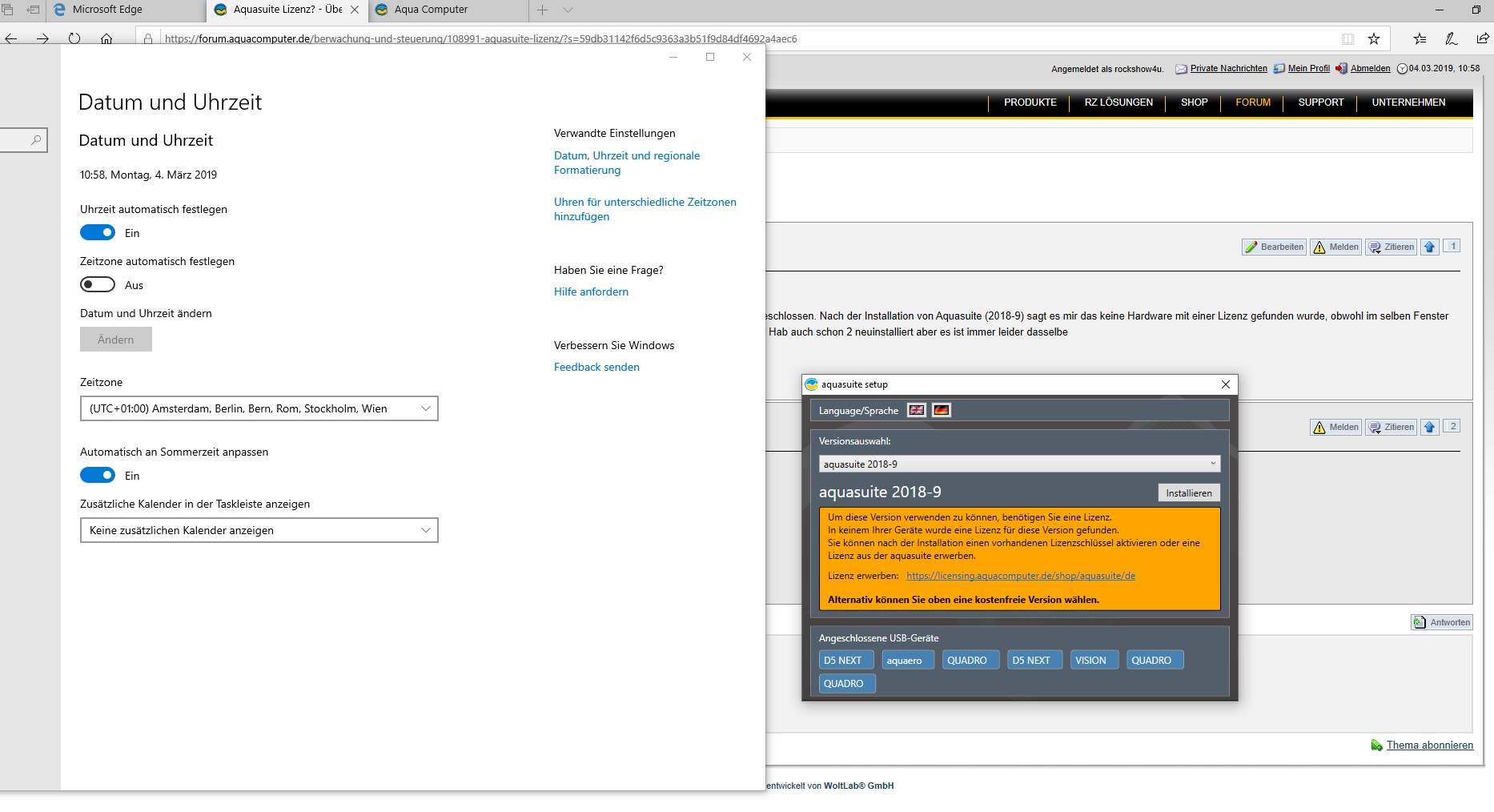 ich hab ein Aquaero 6LT erworben diesen, sowie alle anderen Aquacomputerteile (D5Next, Vision, Quadro) per USB angeschlossen. Nach der Installation von Aquasuite (2018-9) sagt es mir das keine Hardware mit einer Lizenz gefunden wurde, obwohl im selben Fenster alle angeschlossen USB-Geräte angezeigt werden (Next, Aquaero, 3 x Quadro und einmal Vision) was mache ich falsch? Hab auch schon 2 neuinstalliert aber es ist immer leider dasselbe