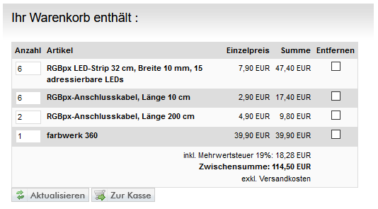 Preislich geht das natürlich bedeutend billiger. Ich habe für 5 Meter mit 30 LEDs/m ingesamt 10€ inkl. Versand bezahlt. Nachteil: Es dauert 3 Wochen bis es da ist, da es aus China kommt (im Moment könnte es noch länger sein.) Ich würde mal beim Chinesischen Ebay-Pendanten schauen.