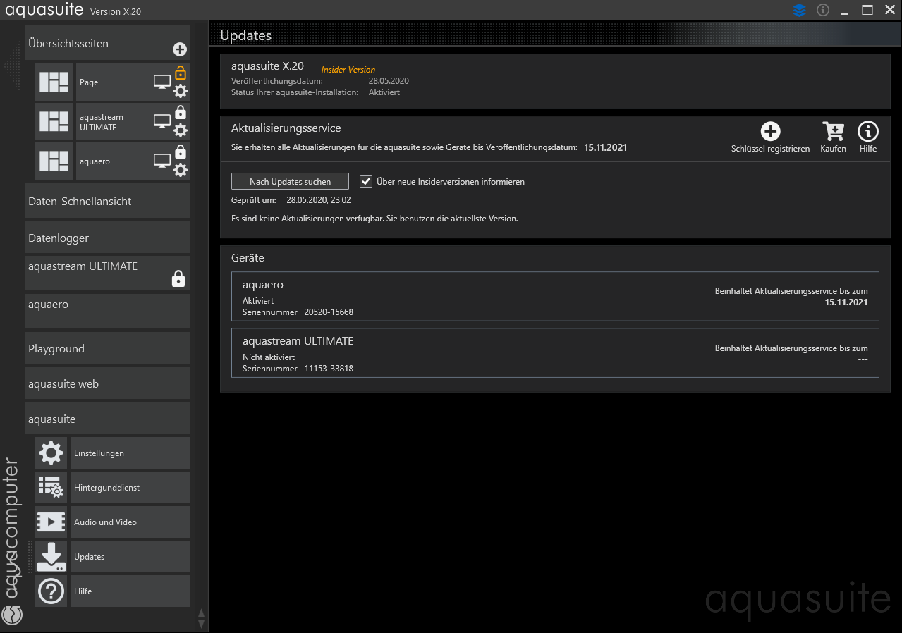 ich habe bei meiner frisch installierten Wasserkühlung leider mit meinem Aquastream Ultimate ein Problem in der Aquasuite. Das Gerät wird mit dem Schloss Symbol als "gesperrt" angezeigt und bei einem Klick auf die Schaltfläche werde ich in das Updates-Menü geworfen.