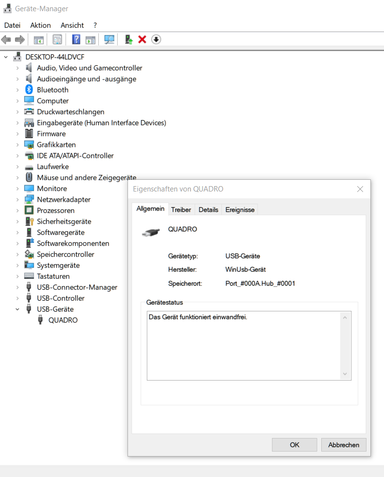 Daraufhin habe ich im Geräte-Manager nachgeschaut und dieser zeigt mir ein USB-Gerät mit dem Namen "Quadro" an.