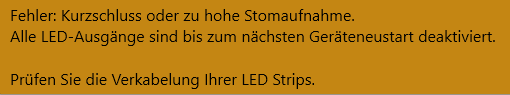 Es wird der Fehler angezeigt: "Kurzschluss oder zu hohe Stromaufnahme. Alle LED-Ausgänge sind bis zum nächsten Gerätestart deaktiviert.Prüfen Sie die Verkabelung Ihrer LED Strips." (Ein Screenshot der Fehlermeldung habe ich angehängt)