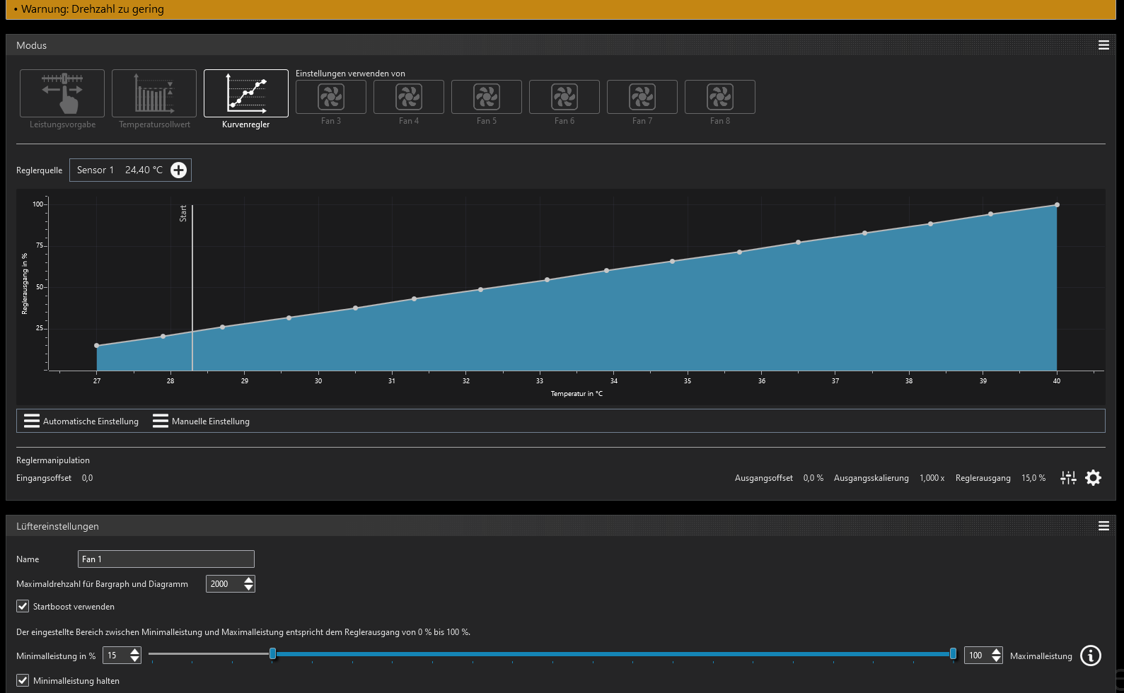 Eigentlich sagt die Überschrift schon alles, ich versuche meine Gehäuselüfter abhängig von einem Temperatursensor steuern zu lassen. Wenn ich die Lüfter direkt an den Octo stecke funktioniert das auch ohne Probleme, wenn ich den Splitty9 per "Leistungsvorgabe" ansteuere funktioniert das Ganze auch. Wenn ich allerdings den Splitty9 anschließe gehen die Lüfter auf 100% Leistung wenn ich Temperatur oder Kurvenregler wähle.