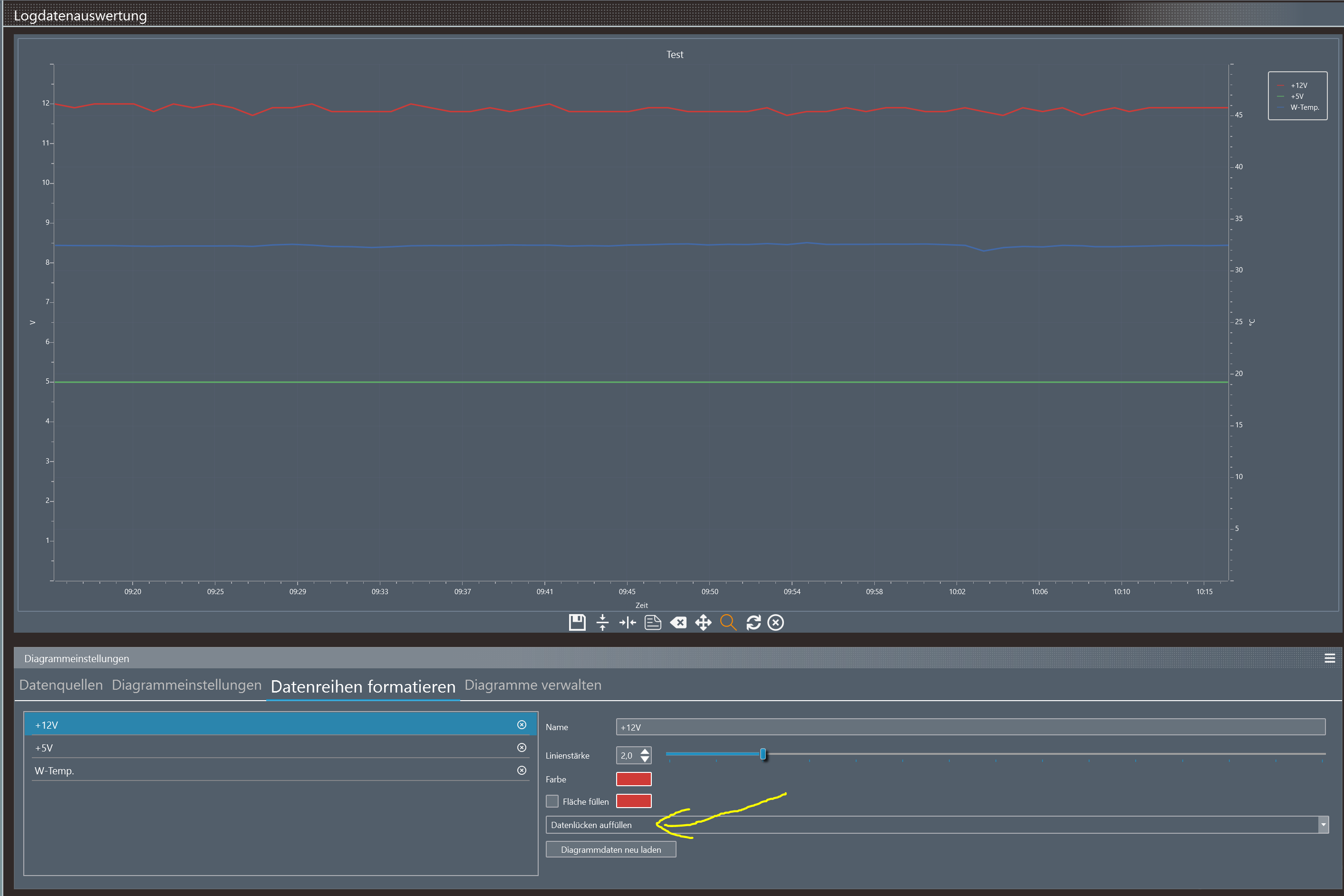 Wenn in den Parametern "Datenreihen formatieren" die Auswahl "Datenlücken ausblenden " ausgewählt wird, werden keinerlei Datenpunkte mehr im Diagramm angezeigt. Befindet sich der Mauszeiger im Diagrammfeld, werden aber die Messwerte in der Legende eingeblendet.