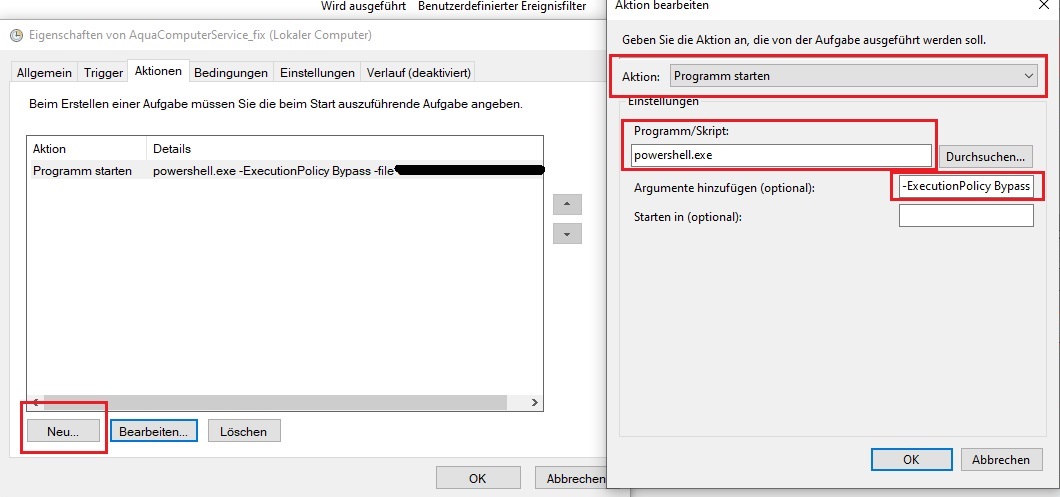 Im Reiter Aktionen nun eine neue Aktion hinzufügen und als Programm "Powershell.exe" angeben und als Argument "-ExecutionPolicy Bypass -file DEIN PFAD ZUR DATEI"