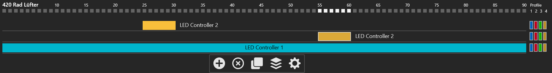Bei 4 Lüftern die je 2 unabhängige Zonen haben (Rahmen und Rotor) bräuchte man insgesamt 8 Controller um alle Bereiche unabhängig zu steuern, man kann aber nur 6 LED Controller in der aquasuite pro Strip erstellen.