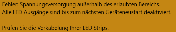 Seit den letzten Aktionen ist es nur noch schlimmer geworden. Der Rechner startet, die RGB Ausgänge arbeiten normal, und werden dann einfach so und ohne nachvollziehbaren Grund nach ein paar Minuten die Stripes mit der immer gleichen Fehlermeldung abgeschaltet.