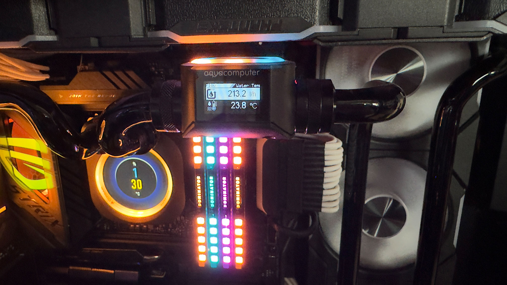 Asus TUF Gaming B650-Plus - 7800X3D - AC Core1 - 64GB G.Skill Trident Z DDR-6000 - MSI GeForce RTX 4090 Gaming X Trio - Alphacool Core Geforce RTX 4090 Suprim mit Backplate - 1 x Samsung SSD 990 Pro 2TB - 1 x Samsung SSD 970 Pro 1TB - Coolermaster HAF Evo 700 mit 2 x 200 und 2x120mm Caselüfter- 12 x Noctua A12x25 auf 4 Stück 360mm AC Radiatoren - AC Ultitube D5 200 - AC Leakshield - AC High Flow NEXT - diverse Tempsensoren