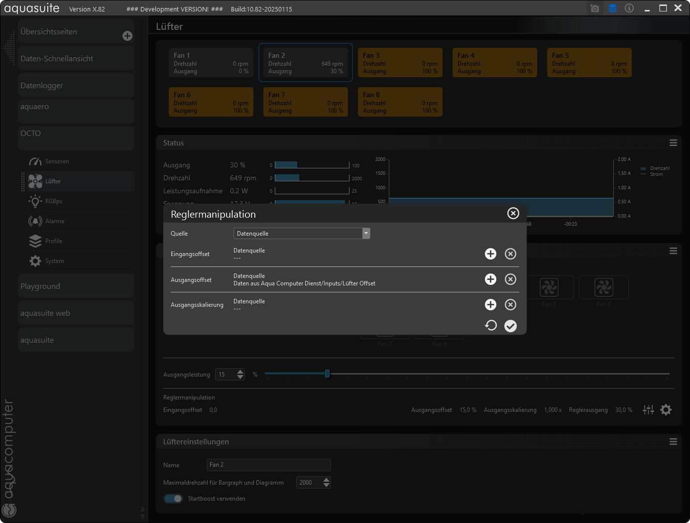 Beim Lüfter-Ausgang des OCTO hast du im Abschnitt Modus eine Reglermanipulation. Klick da auf das Zahnrad, wähle bei Quelle Datenquelle aus und geh bei Ausgangsoffset auf auf das Plus-Icon und wähle unter Daten aus Aqua Computer Dienst -> Inputs -> Lüfter Offset (oder wie es benannt wurde) aus.