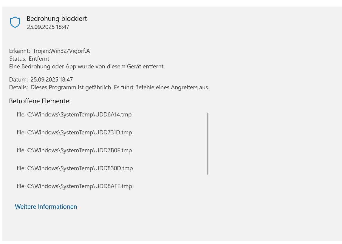 Ich erhalte nun auch die Meldungen, dass beispielsweise file: C:\Windows\SystemTemp\UDD6A14.tmp Bedrohungen sind.
