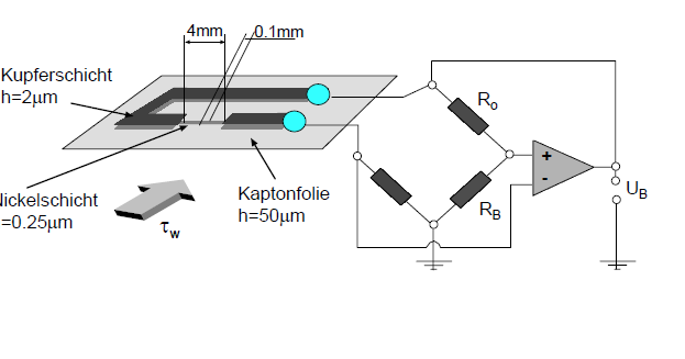 Ist eine wheastonsche Brücke, bei der ein Widerstand ein Heißfilmsensor ist. Dieser ändert seinen Widerstand aufgrund einer Tempänderung, da er von einem Fluidüberströmt wird.