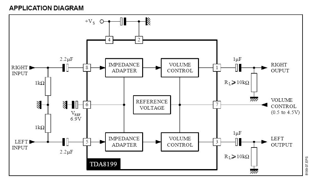 Diesmal ist es ein TDA 8199. Dieser IC ist grob gesagt ein Lautstärkeregler der über Gleichspannung von 0.5 bis 4.5 Volt die Lautstärke anpasst.