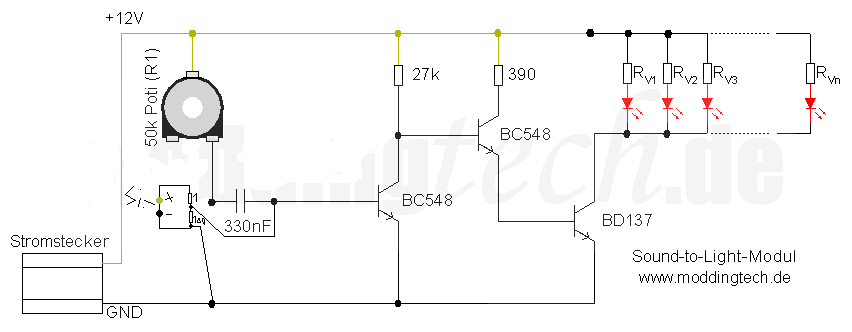 . Wenn man an dem 100k Poti dreht flakern die LED's zwischendurch -,- . Selbst wenn ich den Sound voll aufdrehe passiert aber sonst leider nichts. Zusammen gelötet habe ich es GENAU so wie oben in der Zeichnung.