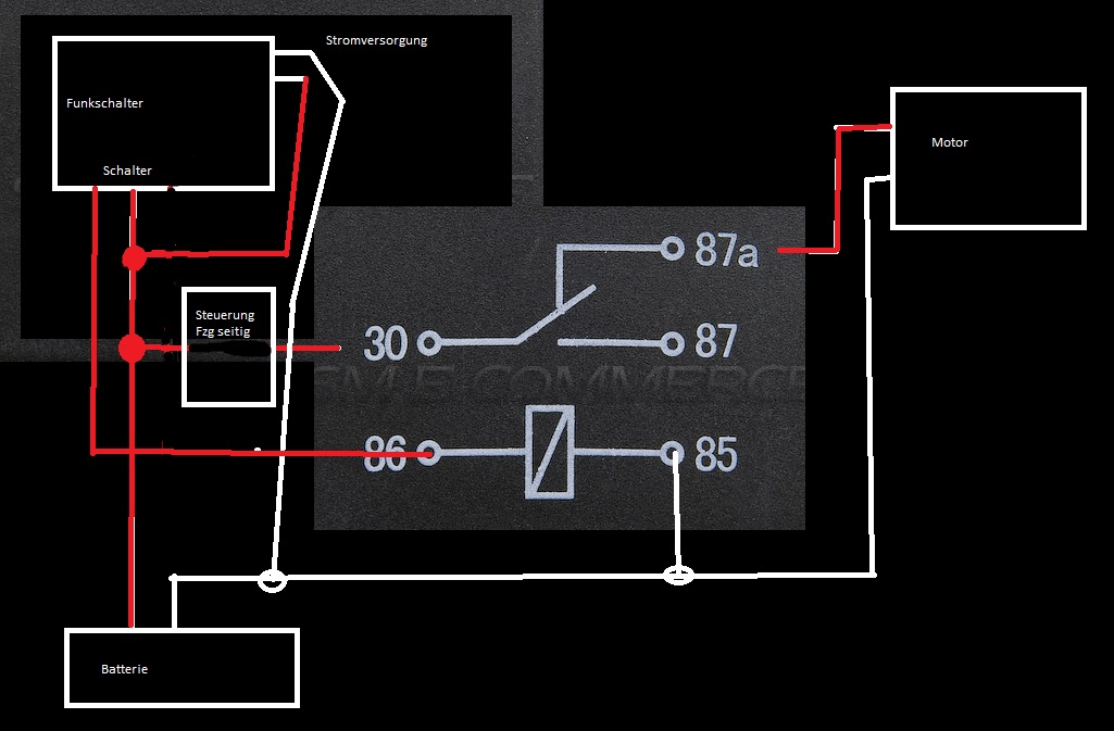 Genau, von der Batterie (Plus) zum Funkschalter, dann an 85 und von da aus über die Spule und 86 wieder auf Masse. Die Motorzuleitung auftrennen und zwischen 30 und 87a klemmen. Dann müsste wenn du die FB drückst, der Funkschalter schließen, das Relais anziehen und der Motor Stromkreis geöffnet werden.
