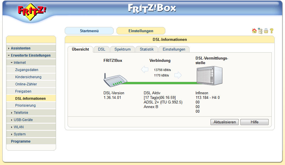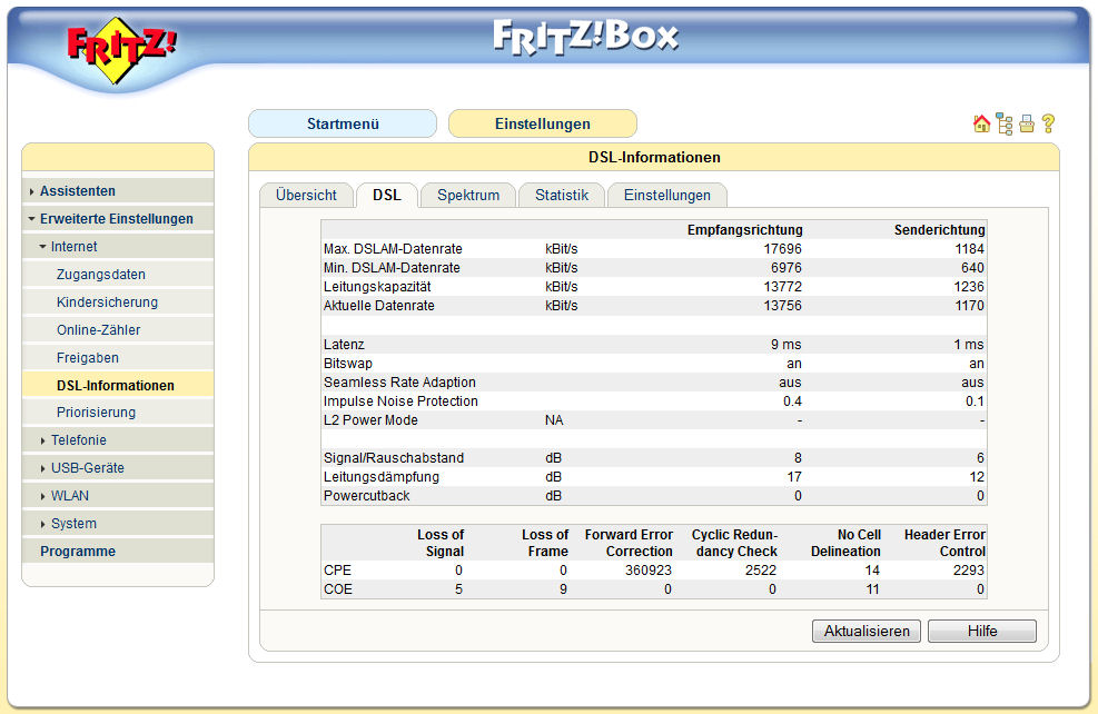 So schaut das derzeit in meiner Fritzbox aus (T-DSL 16000, etwa 1500m Anschlusslänge):