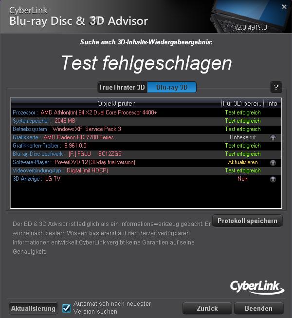 ich habe ein Problem beim Abspielen von 3D Blu Rays. PowerDVD12 gibt mir als Fehlermeldung "Eine Disc mit einem nicht unterstützten Format befindet sich in Laufwerk H:" Das Abspielen im Side-by-Side-Verfahren funktioniert also ebenfalls nicht. 2D Blu-Rays laufen aber. Die 3D Funktion läuft auf dem Fernseher von anderen Geräten (Fuji W3).