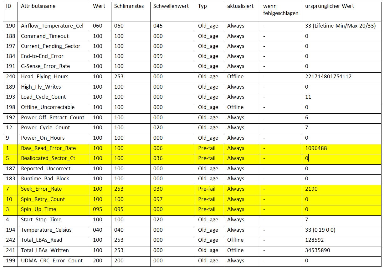 Und jetzt überlegen wir nochmal wofür NAS steht...Also so weit ich mich erinnere, deutet ein 'Error' in der 'Spin_Up_Time' oft darauf hin, dass ein Lager den Geist aufgibt. Da Desktop-Festplatten nicht für 24/7-Einsatz gebaut sind, anders als RAID- oder NAS-Festplatten, veschleißen deren 'minderwertigere' Kugellager schneller bei Dauereinsatz.
