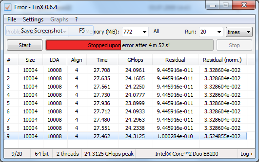 also wenn linx mit maximaler speichernutzung für ~30min ohne fehler läuft, kannste davon ausgehen, dass der pc in allen situationen stabil läuft (mal grafik-last außer acht gelassen). du erreichst damit übrigens auch die maximale cpu-temperatur (die ist 5-10 grad höher als mit prime95...).
