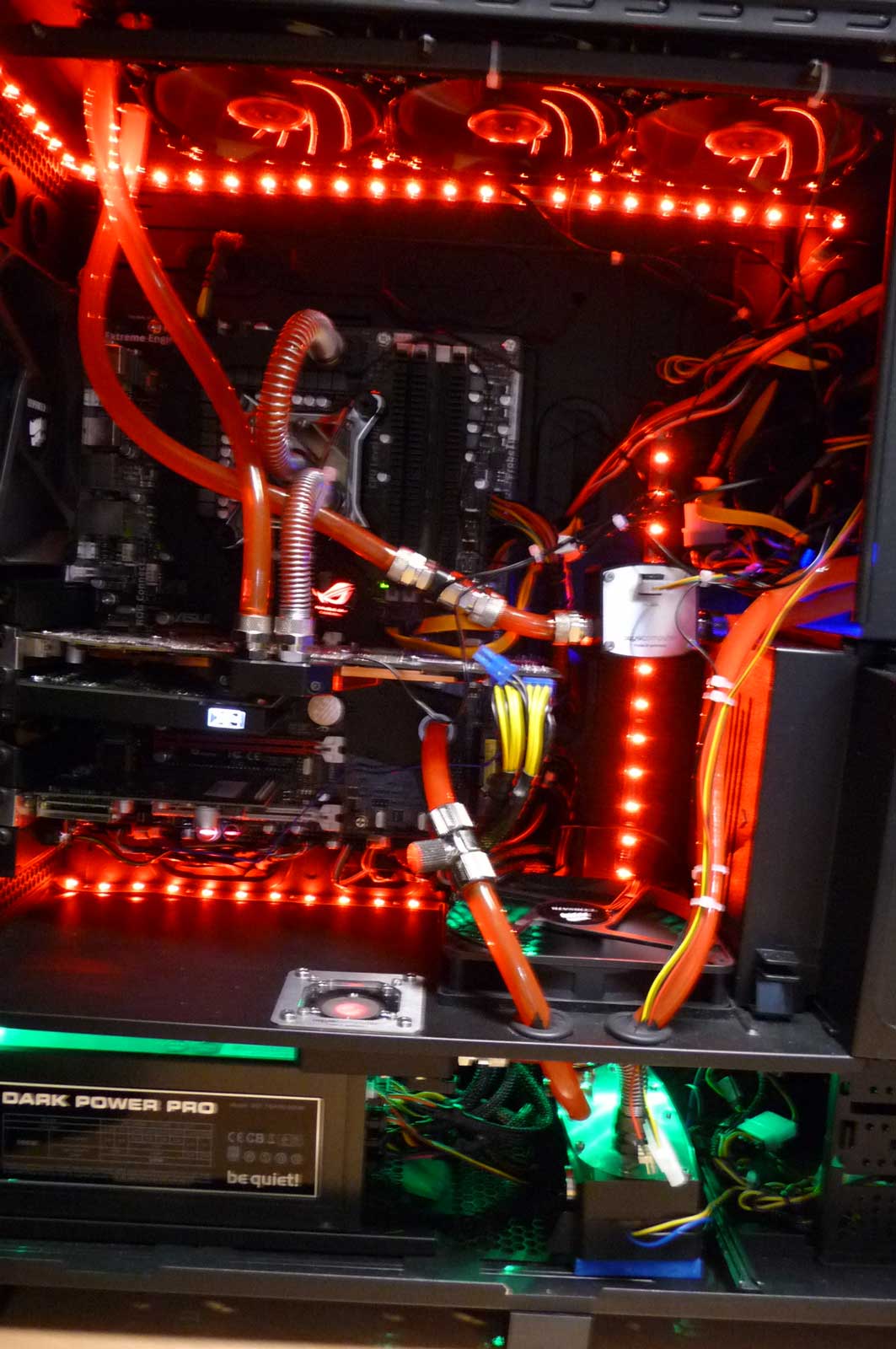 Den Knickschutz wirst relativ leicht los. Bei der Kühlung gibt es keine feste Reihenfolge für die zu kühlenden Teile. Richtig ist was gut aussieht und vor allem dir gefällt. So wie das auf den bildern aussieht, hast du absichtlich keine Winkel. Nichts gegen zu sagen, wenn man denn Durchflussfetischist ist. Bei dir würde ich doch nicht ganz auf die Dinger verzichten, wenigstens einen an die Grafik mit. Durch den würdest du gut vom der SB zur Grafik kommen. was mich aber ein bißchen irritiert ist, das ich die Leitung von der Southbridge und vom Spannungswandler zum ?( nicht finden kann. Hast du für das Board nen Konplettkühler? Wenn ja ist die Verschauchung ohne Knickschutz und ohne Winkel leicht. Machst du die Reihenfolge Spannungswandler (Ausgang vom Komplettkühler) --> Grafik--> CPU--> Radiator müßte das funktionieren. Den Schlauch Grafik/CPU hälst du sammt den Knickschutz unter heißes Wasser und läst den dann wieder kalt werden. Dann kannst den Knickschutz ab machen, der Schlauch bleibt dann auch so in Form. Und den Durchflußmesser würde ich versuchen, rechts oben neben das Board zu machen. Kommst vom Radiator zum Dfm und dann zur Pumpe auch ohne Winkel aus. Naja und die Rummelbude... ;) Kannst ja evtl die LED Streifen an das Seitenteil pappen oder so im Gehäuse befestigen, das sie nach innen strahlen. Wäre auch alles richtig rot, würde aber nicht so in den Augen brennen.