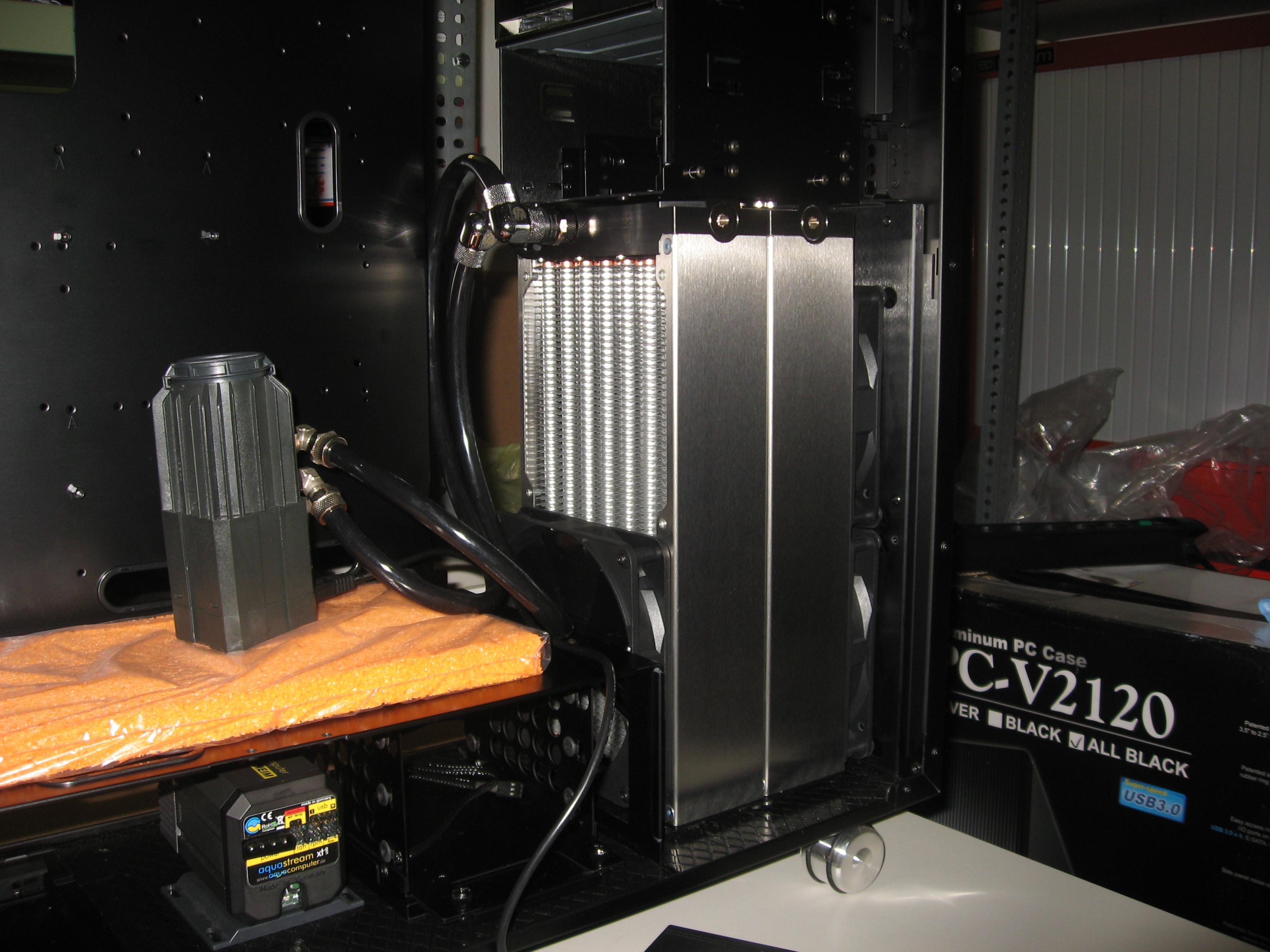 Die Luftzug im Gehäuse selbst dürfte auch ausreichen, da in der Gehäusefront sich drei 80er und nach hinten raus noch 2 80er Pabstlüfter befinden. Den 3. hinten raus musste ich leider entfernen, da das AMS irgendwie länger als geplant war und die Pumpe jetzt hinten aus dem Gehäuse herausragt. Das Gehäuse ist doppelt gedämmt, da ich ja vorher das Ganze mit Luftkühlung versorgte. (gott sei dank ist das jetzt rum) Ich denke mal, dass der ganze Rechner inzwischen locker 35 kg hat! Fester Stand ist somit garantiert! :D