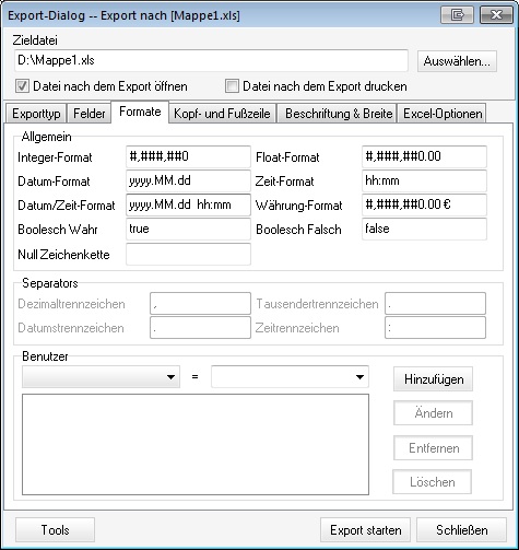 ich habe das Programm DirPrinter und möchte nun eine Dateiliste eines Ordners in Excel erstellen. Nun macht der das auch, allerdings möchte ich dass die Dateien nach demn Änderungsdatum geordnet werden was zur Folge hat dass ich diese im englischen Format vorliegen haben muss. Also habe ich das in der Maske angepasst, soweit ich das verstehe, allerdings habe ich keine Ahnung was ich mit Float und Integer anfangen soll, denn es funktioniert nicht wenn ich das so wie unten vorgebe sondern es wird weiterhin das deutsche Format ausgegeben.