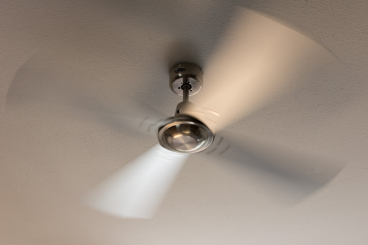 Westinghouse Splendor, bewußt ohne Lampe. Die 4-Stufen-Steuerung befindet sich in der Wand anstelle des Schalters vorher. Und bevor Fragen aufkommen: Ja, die Blätter sind eigentlich "falsch" montiert. Mir gefällts aber besser so rum... ;)