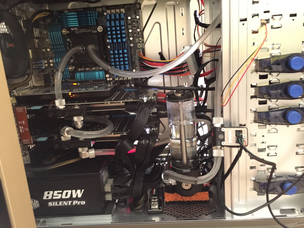 Deine Bilder gefallen mir sehr. Ich glaube, ich machs auch ersteinmal mit Schläuchen und ersetzte die irgendwann durch Akrylrohre.Hier mal zwei BIlder meiner Wasserkühlung. Komponenten siehe Signatur. Ist derzeit alles noch nicht final verbaut, da die Laufwerke noch gegen eine Crucial MX 100 512 GB und eine Western Digital Black 4 TB sowie eine Western Digital Green 4 TB getauscht werden. Liegt schon wieder seit Wochen hier der ganze Kram. Lege bei meinem System auch nicht so viel Wert auf die Optik im Gehäuse (Kabel, etc.).