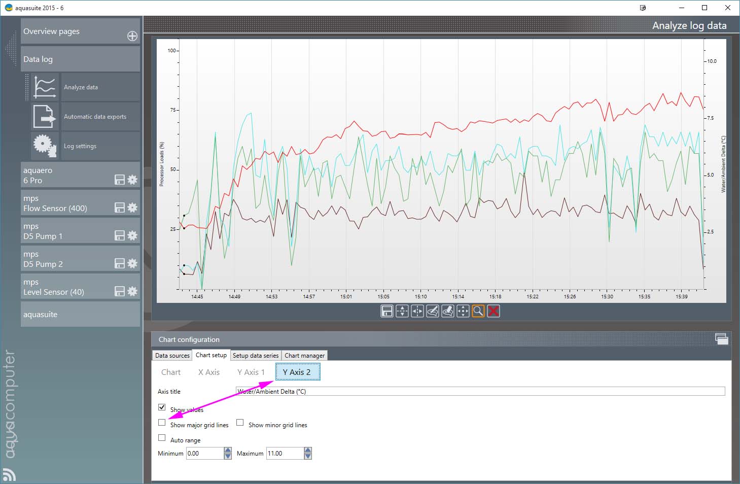 When I create a Data Chart with the Data Log Analyzer in aquasuite, and deselect Major Grid Lines, Major Grid Lines still appear on the Overview Page object created with the Add New Item > Log Data Chart option.