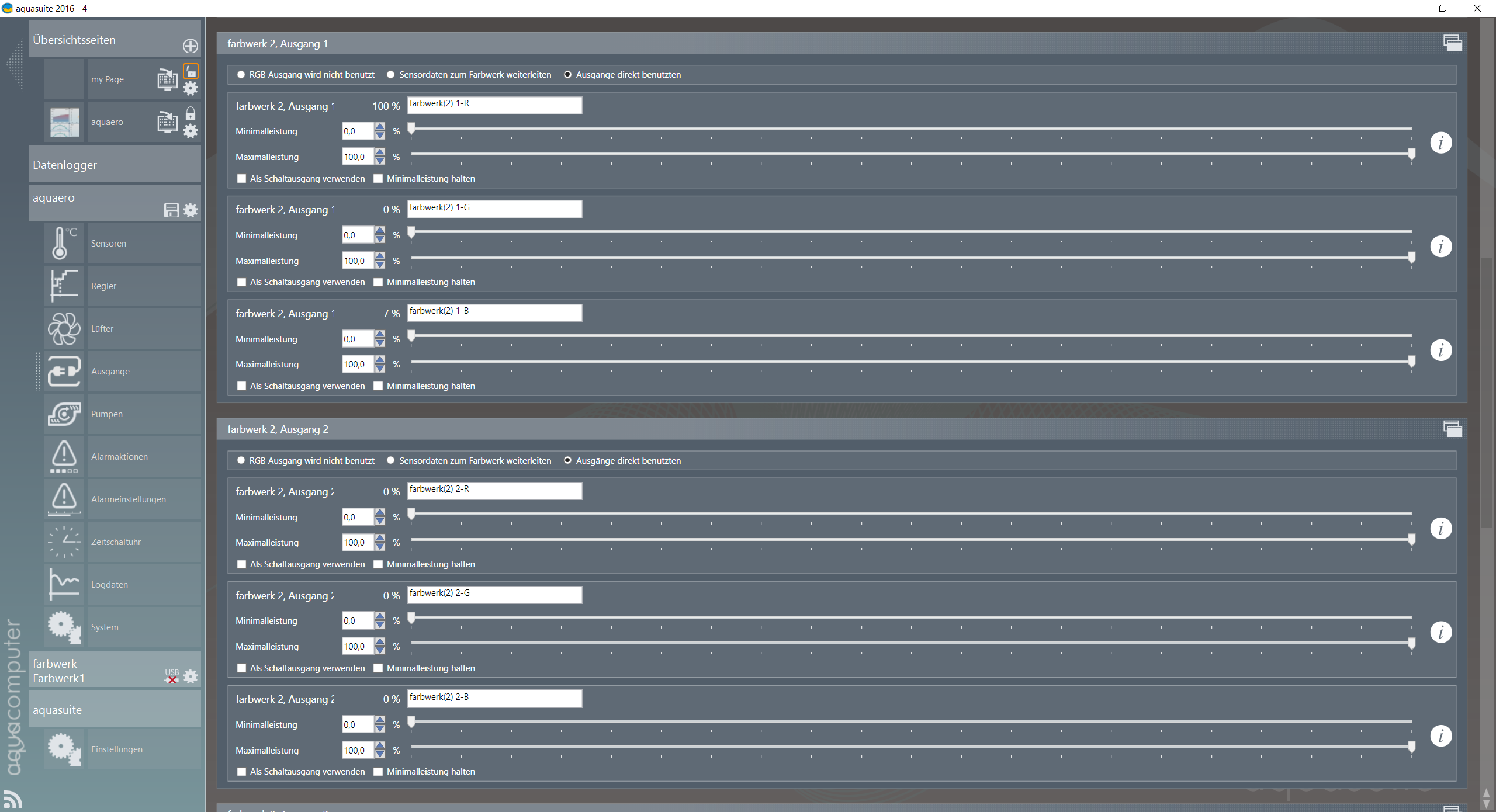 4. Ich setzte im Aquaero 5 Ausgänge Tab alle Farbwerk Ausgänge auf Direkt Benutzen um die Farbwerkausgänge bei meinen Aquaero Reglern auswählen zu können (Ist dies korrekt so?)
